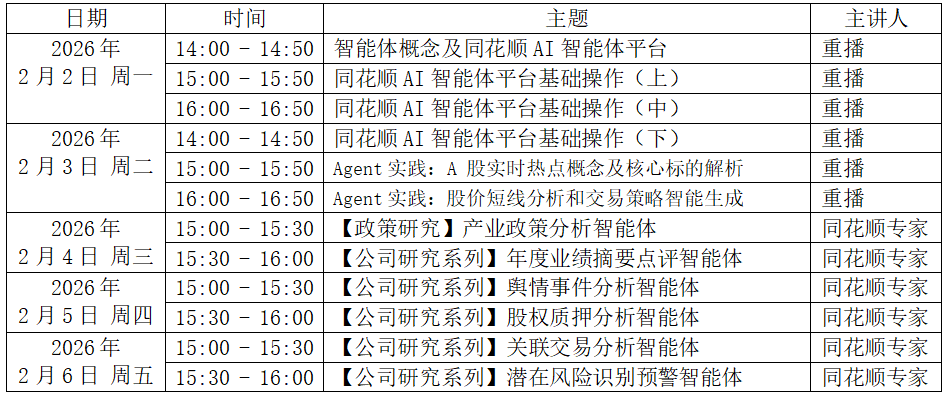 为响应国家《新一代人工智能发展规划》和金融科技人才培养战略,助力高校教师把握AI金融前沿动态、提升智能体开发与教学能力,杭州同花顺数据开发有限公司举办2026年寒假金融智能体应用线上师资培训,组织学院教师积极参加本次培训活动,现将具体事项通知如下: